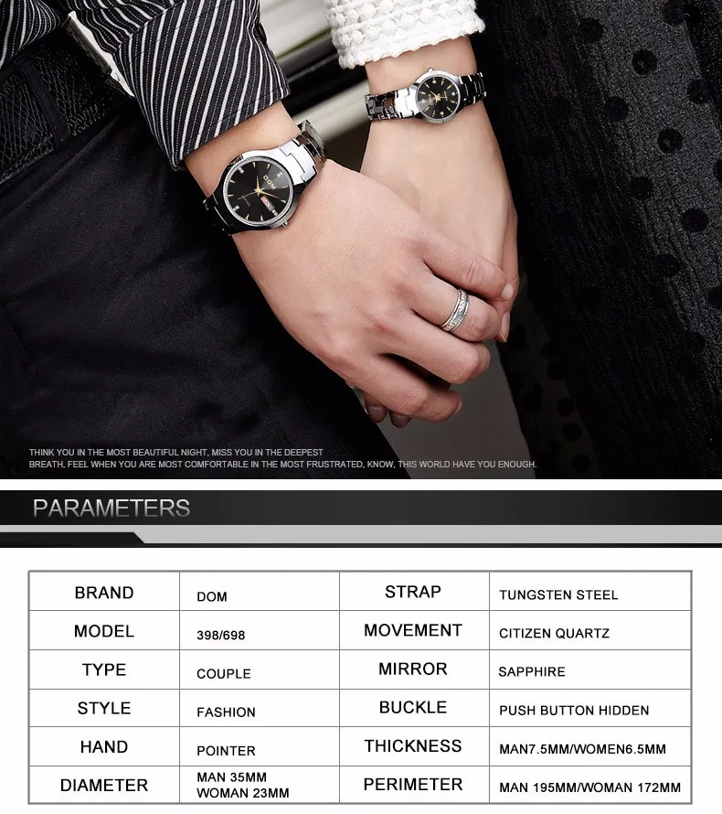 Best Water High Rating provide Lover's Watches, Cheap Lover's Watches, DOM Lovers' watch Luxury Top Brand Men's Watch tungsten steel Wrist Watch waterproof Business Quartz Fashion sport Watches Clock Terrific New DOM Lovers' watch Luxury Top Brand Men's Watch tungsten steel Wrist Watch waterproof Business Quartz Fashion sport Watches Clock. Get 50% discount Now! Now US $46.19/piece. Hurry buy Now before back to normal price! Normal price US $92.38. Dont waste your time. Buy Now only in DOM ^_^Day Store Trusted Seller Store!